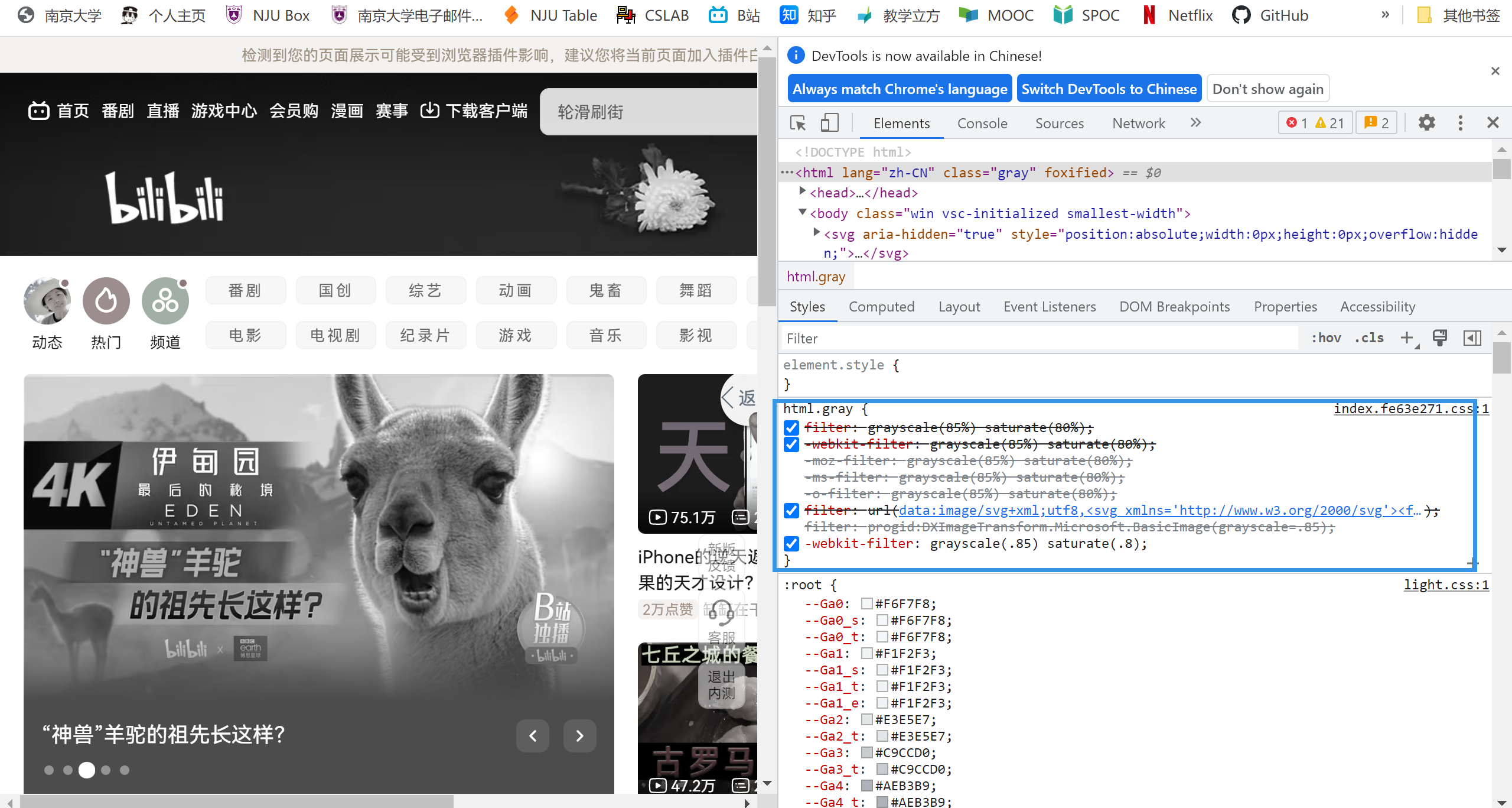 在各大网站中,参考b站html,并没有100%的变灰,可以看出保留了一点色彩区分度,便于使用。