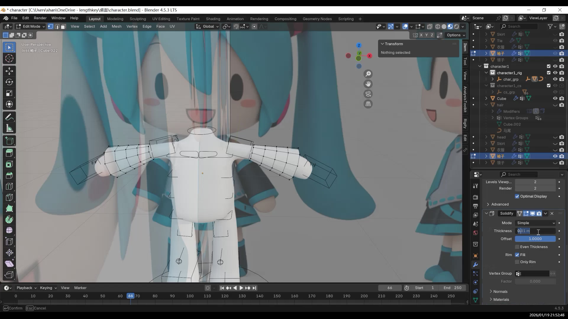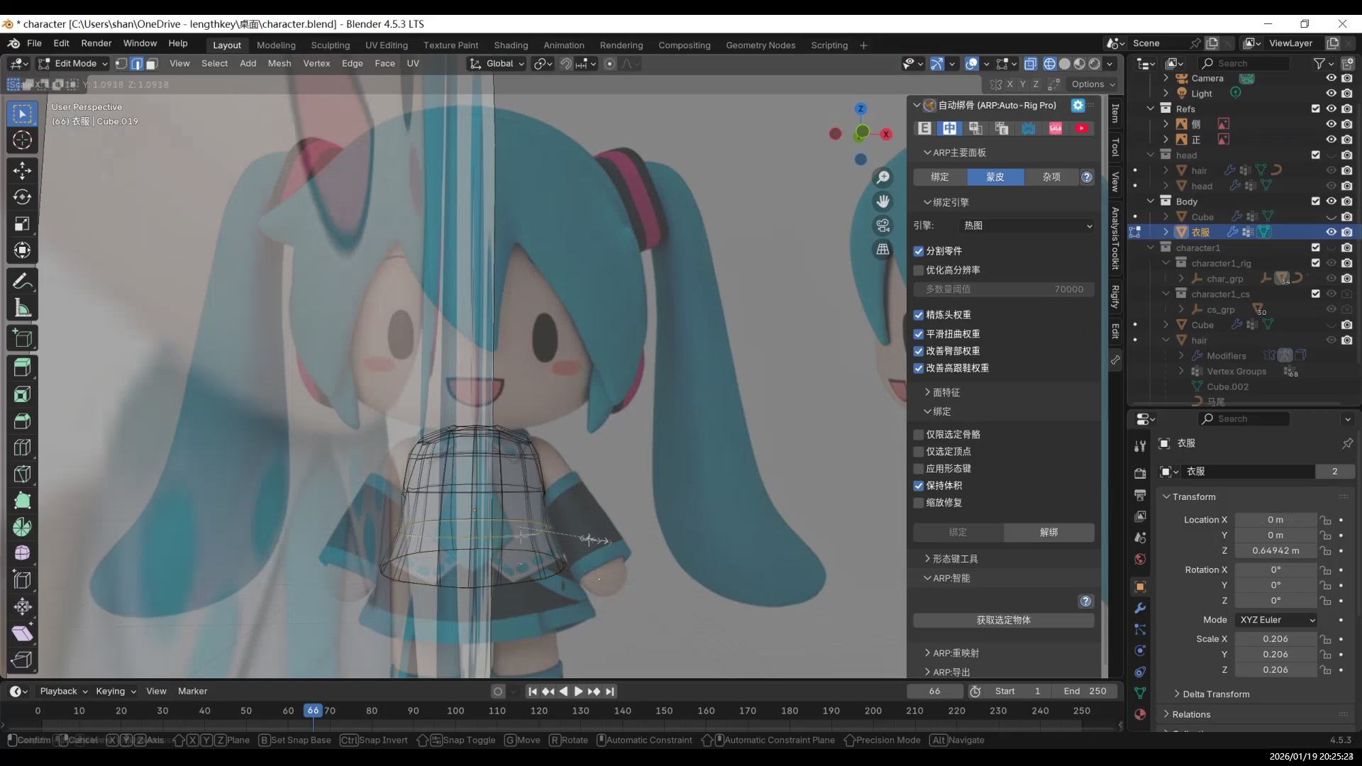 进入衣服的编辑模式,全选后用法线方向缩放,把衣服整体往外顶一点点,这一步可以有效避免和身体重叠造成的破面问题。